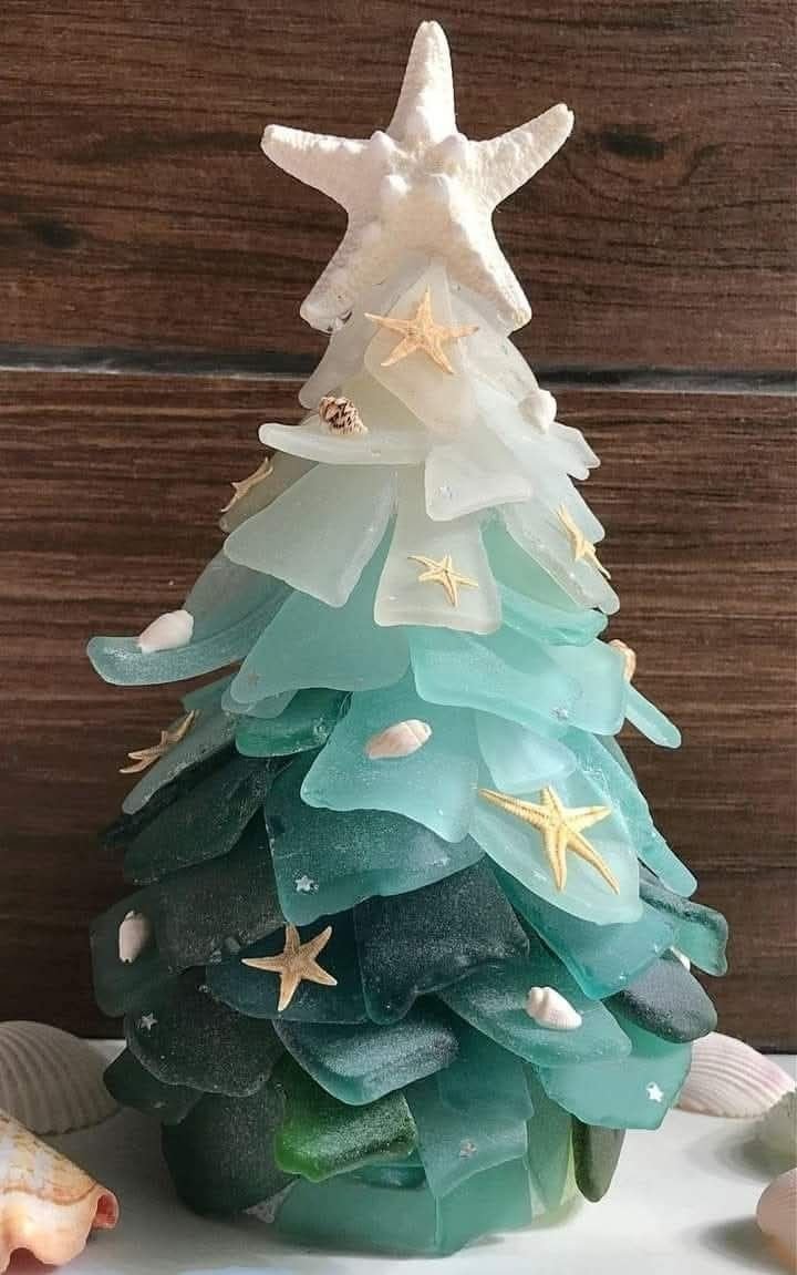 Create a collection of Christmas trees and individual ornaments using sea glass, shells, beads, and sparkle for a festive vignette. Add the provided twinkle lights for extra holiday magic!