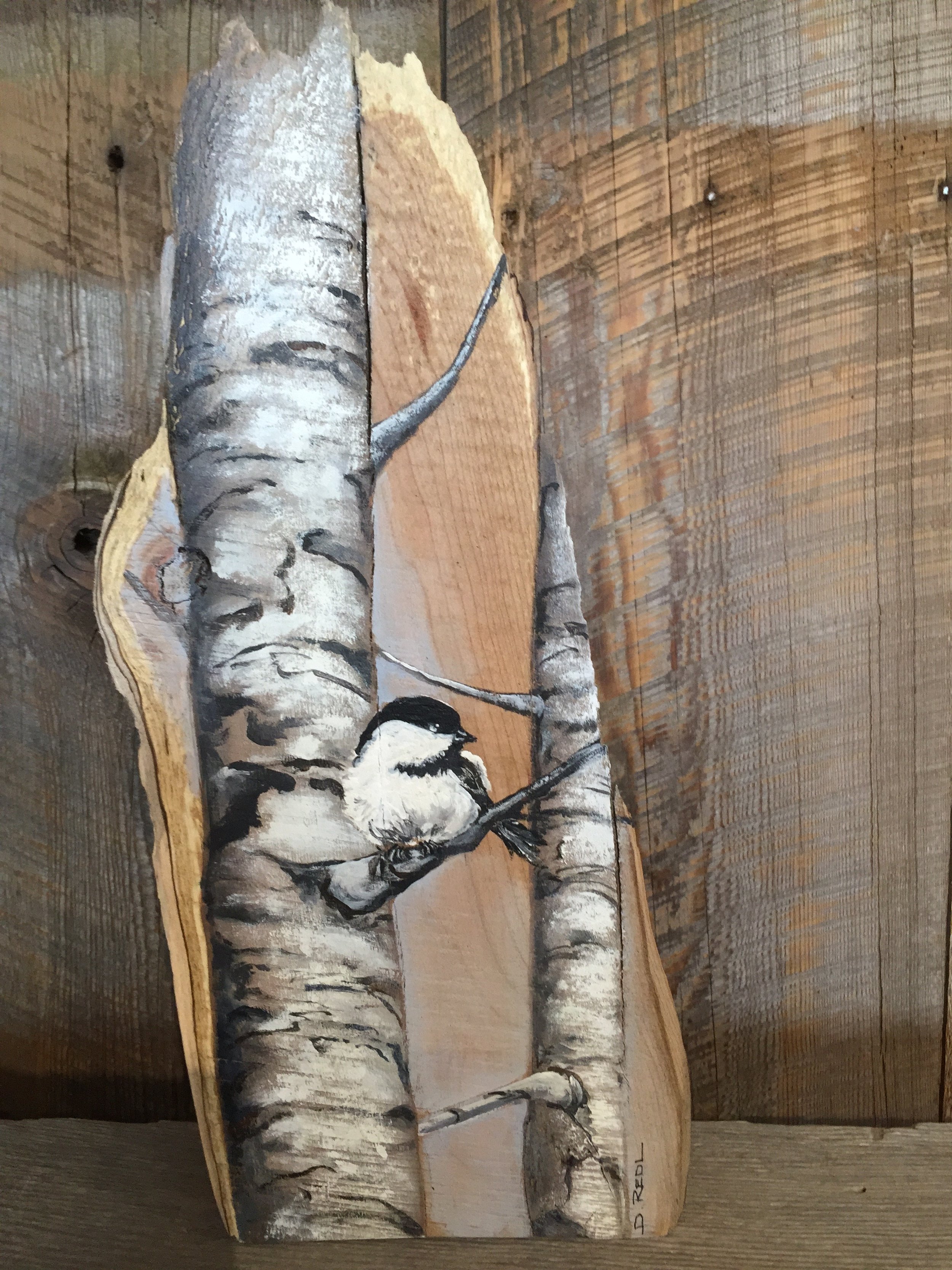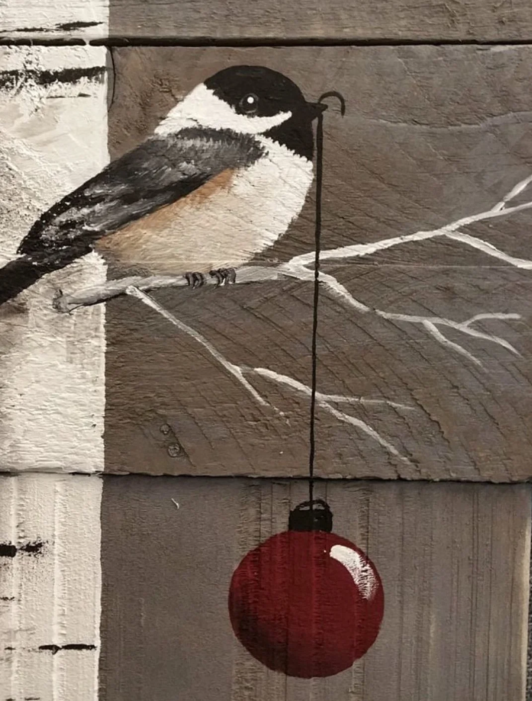 Switch out your artwork for this festive painting of a Chickidee in snowscape. Add warmth to your home and a touch of sparkle with this winter scene.